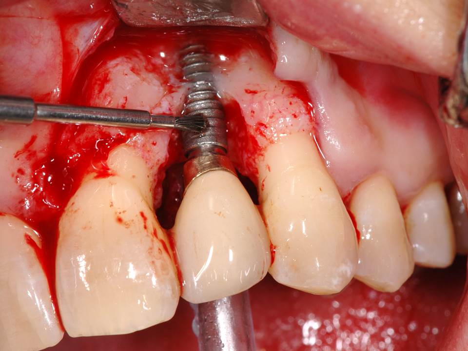 In unserer Praxis besteht die chirurgische Behandlung aus drei Schritten – Entfernung von Entzündungsgewebe, mikroskopisch genaue Reinigung (Dekontamination) der Implantatoberfläche  und Regeneration des Knochens.  Letztere Maßnahme bewirkt eine Anhebung des Taschenbodens, so daß den Bakterien in Zukunft die geschützten Rückzugsräume genommen werden. Nach Abschluß der Behandlung überweisen wir Sie an Ihren Hauszahnarzt zurück.